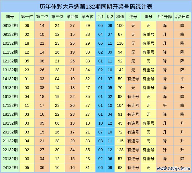 和值分析:在历史同时开奖中,前区和值出现界限在45-142之间,区间内的最大波动差值为97,其中大数和值开出频次较高,共出现了10次,现时大数和值开出了10年,本年同时瞻望和值不竭走小。