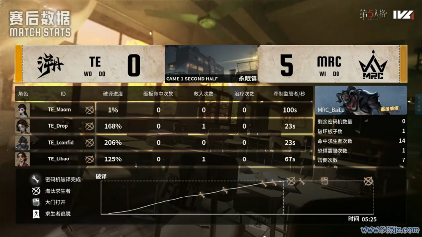 TE的求生者采取了古董商、飘扬家、大副、木偶师;MRC的监管者BaiLu采取了“跛脚羊”。(BAN先知、机械师、庆幸儿、魔术师)