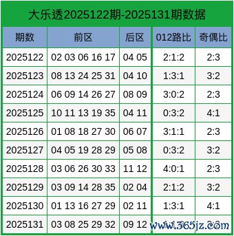 本期大乐透012路比参考:2:1:2。